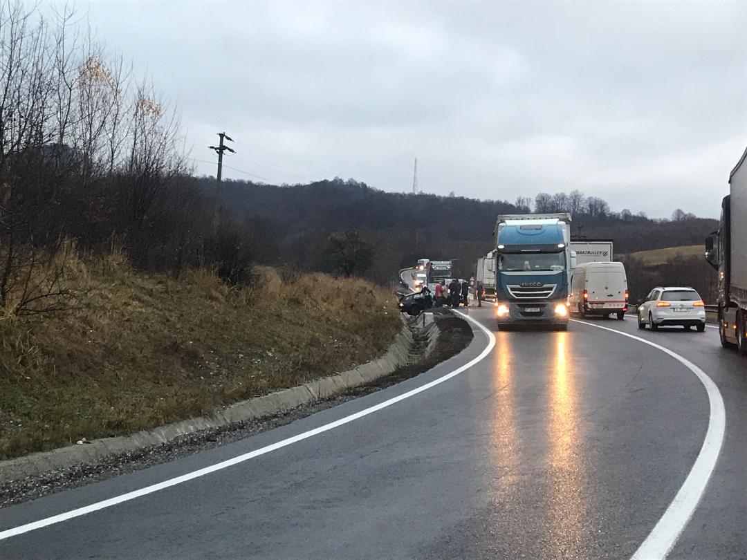 O mașină a derapat și a intrat în șanț, traficul a fost îngreunat.