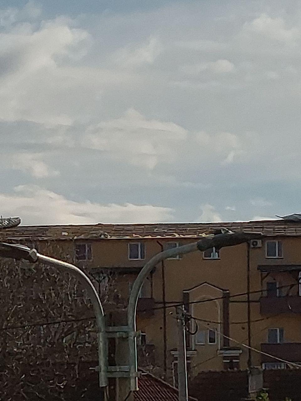 Acoperișul unui bloc din Făgăraș a fost luat de vântul puternic, în această dimineață, la Făgăraș, pe strada Parcului.