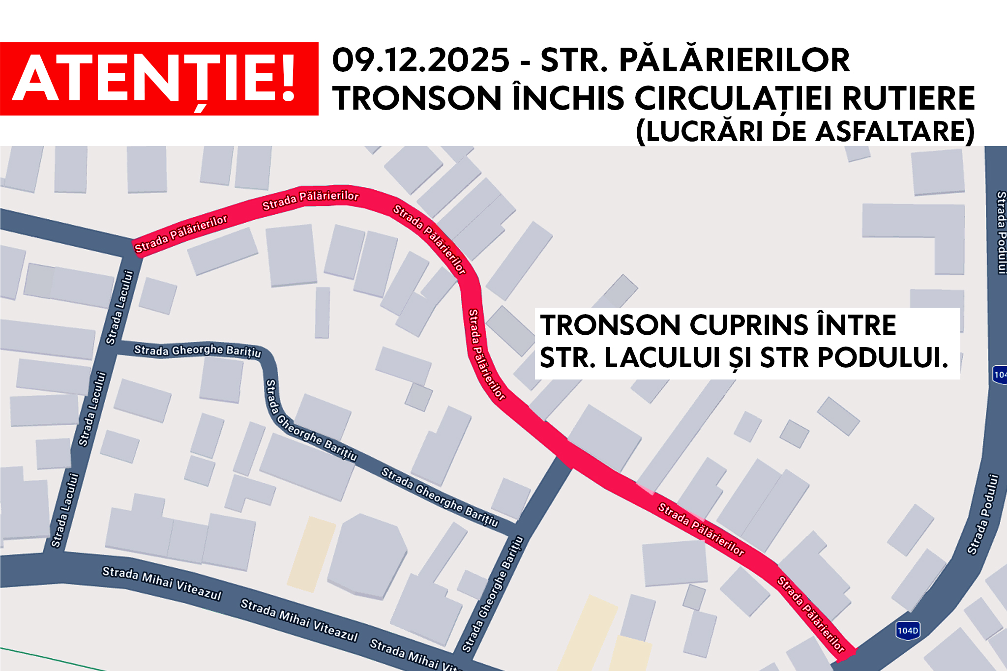 • Marți, 9 decembrie, circulația rutieră pe strada Pălărierilor va fi restricționată pe tronsonul cuprins între străzile Lacului și Podului, din cauza lucrărilor de asfaltare programate în zonă.