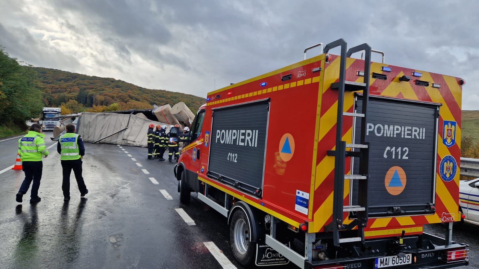 Conform I.P.J. Brașov, traficul rutier se desfășoară îngreunat pe DN1, la ieșirea din Codlea către Sibiu. Din primele verificări, conducătorul autocamionului ar fi pierdut controlul vehiculului și s-ar fi răsturnat pe carosabil. Un echipaj de poliție se află la fața locului și dirijează circulația în mod alternativ, pentru evitarea altor incidente. Polițiștii recomandă conducătorilor auto să manifeste prudență, să reducă viteza în zonă și să respecte indicațiile agenților prezenți.
