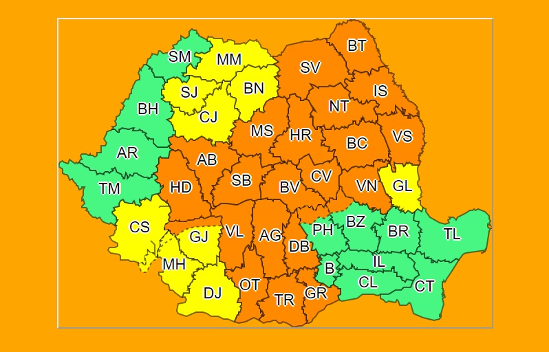 Notã: Astfel de fenomene se vor semnala şi în sud-estul teritoriului, pe arii restrânse, seara şi noaptea.