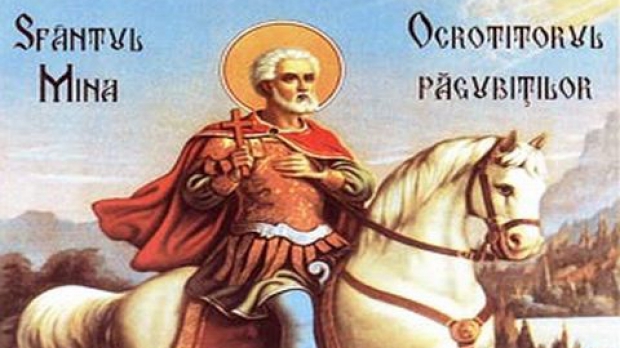 Sfântul Mina este prăznuit la data de 11 noiembrie în calendarul ortodox. Sfântul Mina a fost creştin, de origine egipteană şi ostaş în oastea împăraţilor Diocleţia şi Maximian care au dat ordin să fie torturaţi şi ucişi toţi creştinii care nu se închină idolilor. Mina se afla sub solda tribunului Fermilian şi, văzând ce se întâmplă, a renunţat la simbrie şi a plecat în munte, în pustie, preferând compania fiarelor decât a oamenilor care se închină la idoli. El pribegea de colo-colo, postind şi rugându-se adevăratului Dumnezeu, iar când găsea oameni drepţi şi buni îi învăţa Legea Domnului.Sf. Mina