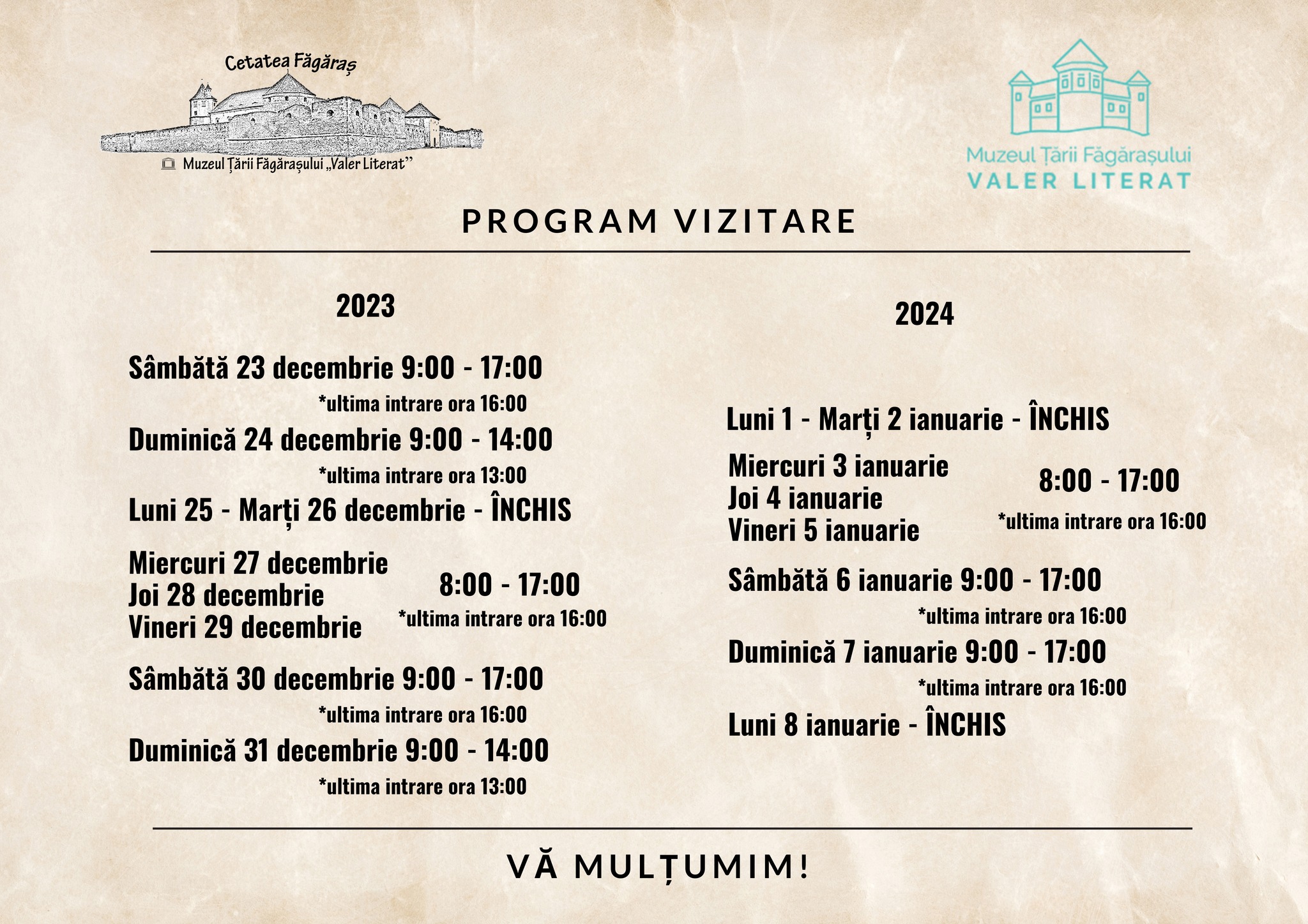 Muzeul Țării Făgărașului ,,Valer Literat” anunță că va fi deschis pentru vizitatori sâmbătă şi duminică, înaintea Crăciunului. Astfel, sâmbătă va avea program cuprins între orele 9.00 şi 17.00, iar duminică între 09.00 şi 14.00. În schimb, în prima şi a doua zi de Crăciun va fi închis. Îşi reia activitatea de miercuri şi până vineri va funcţiona cu program de la 08.00 la 17.00., urmând ca sâmbătă şi duminică, înaintea Revelionului să aibă programul de weekend identic cu cel de dinaintea Crăciunului.