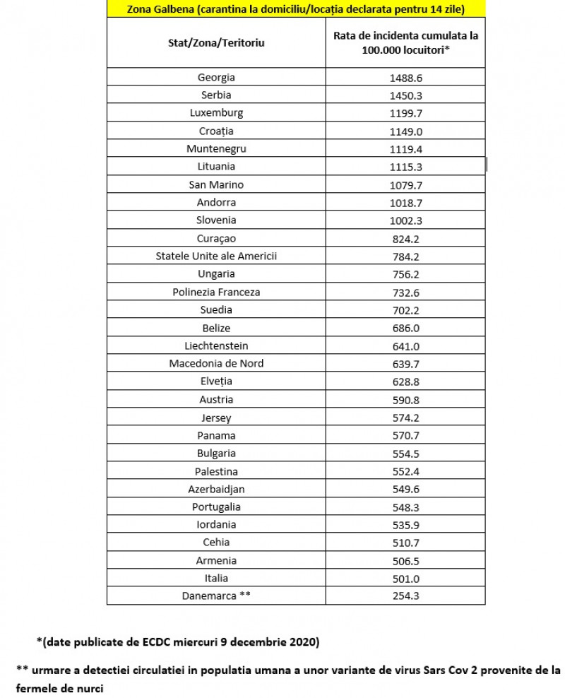 Cei care vin din țările aflate pe listă sunt obligați să stea în carantină 14 zile. Aceștia pot ieși din carantină după a 10 zi, dacă efectuează un test pentru SARS-CoV-2 în a 8 a zi de carantină, iar rezultatul acestuia este negativ și nu prezintă simptomatologie specifică.