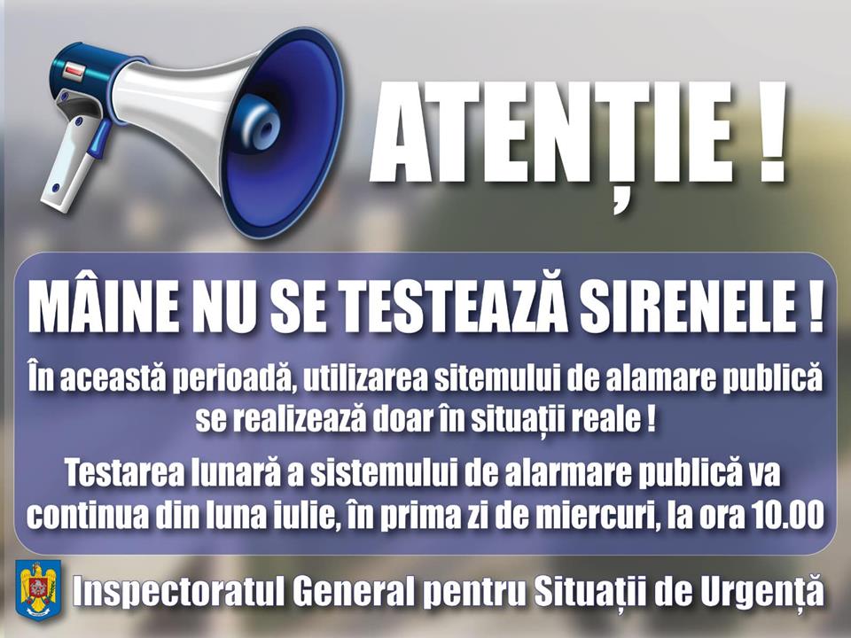 În această perioadă, utilizarea sirenelor se va realiza doar în situații reale în care este necesară dispunerea de măsuri de protecție pentru populație.