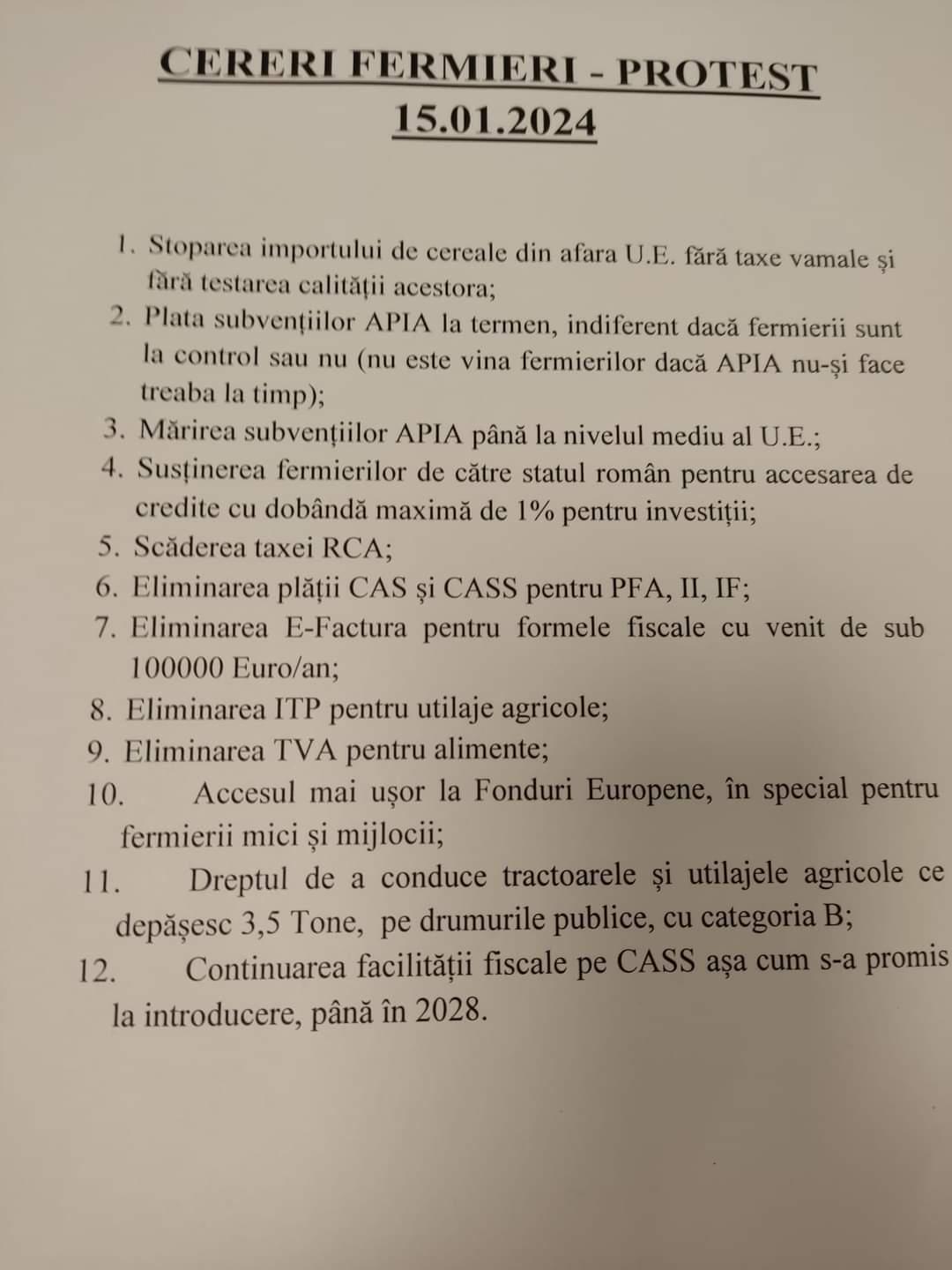 Printre revendicări se numără stoparea importului de cereale din afara UE, fără taxe vamale și fără testarea calității acestora, plata subvențiilor APIA la termen, indiferent dacă fermierii sunt la control sau nu, mărirea subvențiilor APIA până la nivelul mediu al UE, scăderea taxei RCA, eliminarea plății CAS și CASS pentru PFA, II, IF, eliminarea E-factura pentru formele fiscale cu venit de sub 100.000 euro/an, eliminarea ITP pentru utilajele agricole, eliminarea TVA pentru alimente, dreptul de a conduce tractoarele și utilajele agricole ce depășesc 3,5 T pe drumurile publice, cu categoria B.
