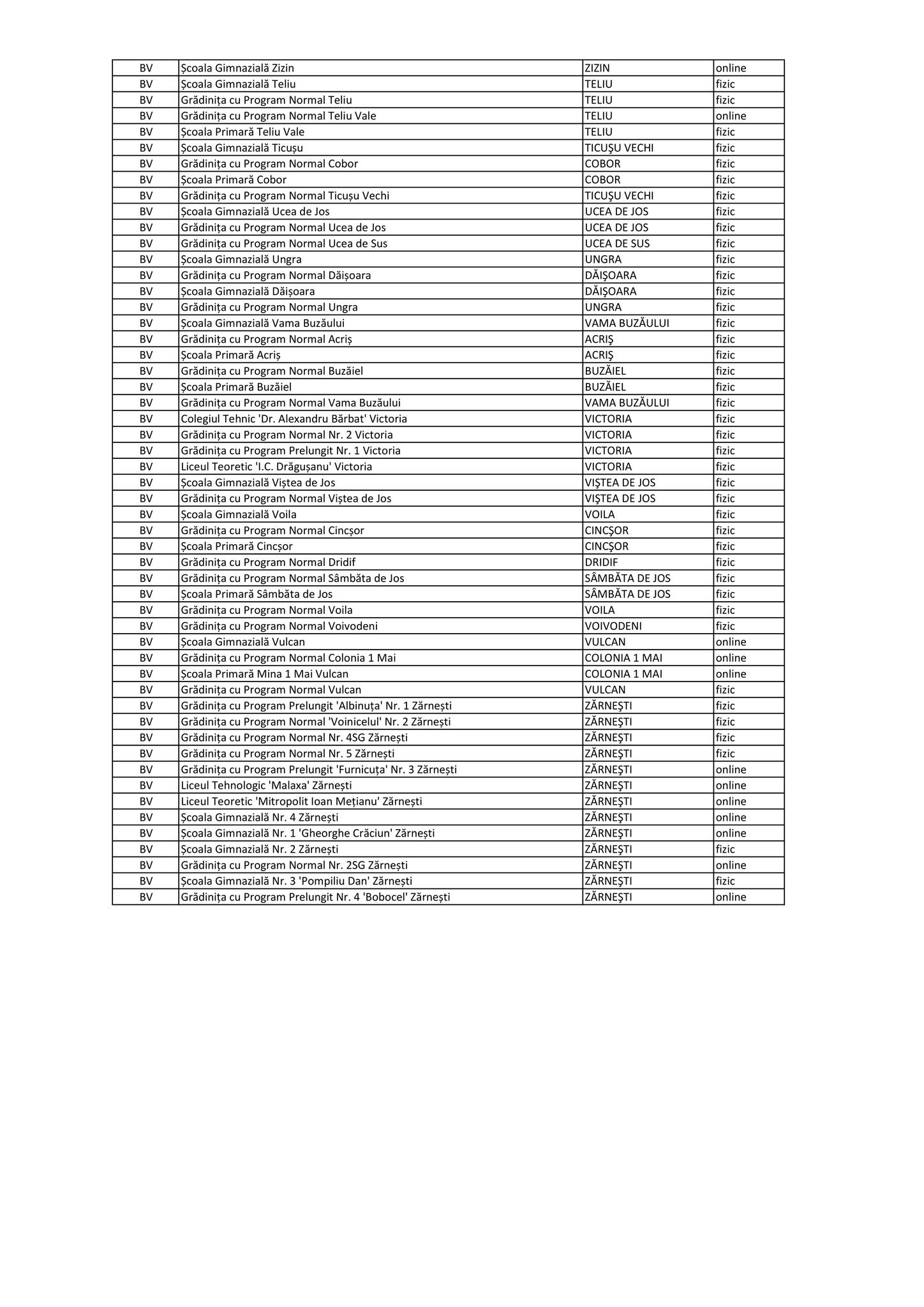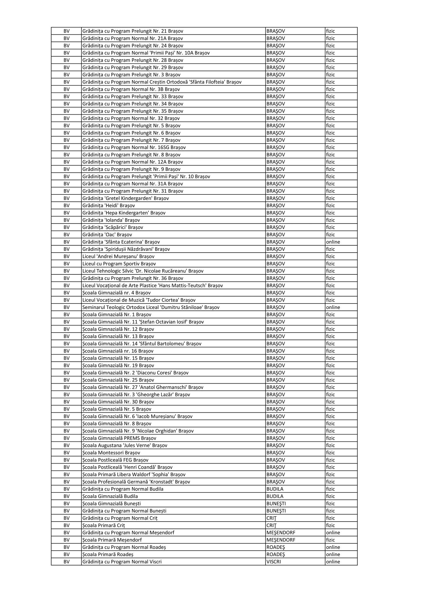 Conform reglementărilor noului ordin, în 62 din 390 unităţi şcolare din judeţul Braşov, activităţile didactice se vor desfăşura în online, în săptămâna aceasta. Este vorba atât de unităţi cu personalitate juridică, dar şi de structuri arondate celor cu personalitate juridică. Lista acestora a fost aprobată de Comitetul Judeţean pentru Situaţii de Urgenţă (CJSU) Braşov, duminică, 21 noiembrie, după ce sâmbătă fusese dată o listă cu 77 de unităţi în această situaţie. Actualizarea are în vedere solicitarea Inspectoratului Şcolar al judeţului Braşov adresată Comitetului Judeţean pentru Situaţii de Urgenţă Braşov; hotărârile Consiliilor de Administraţie ale unităţilor de învăţământ din judeţul Braşov şi incidenţa cumulată a cazurilor de COVID-19, comunicată de către Direcţia de Sănătate Publică Braşov, la data de 21 noiembrie.