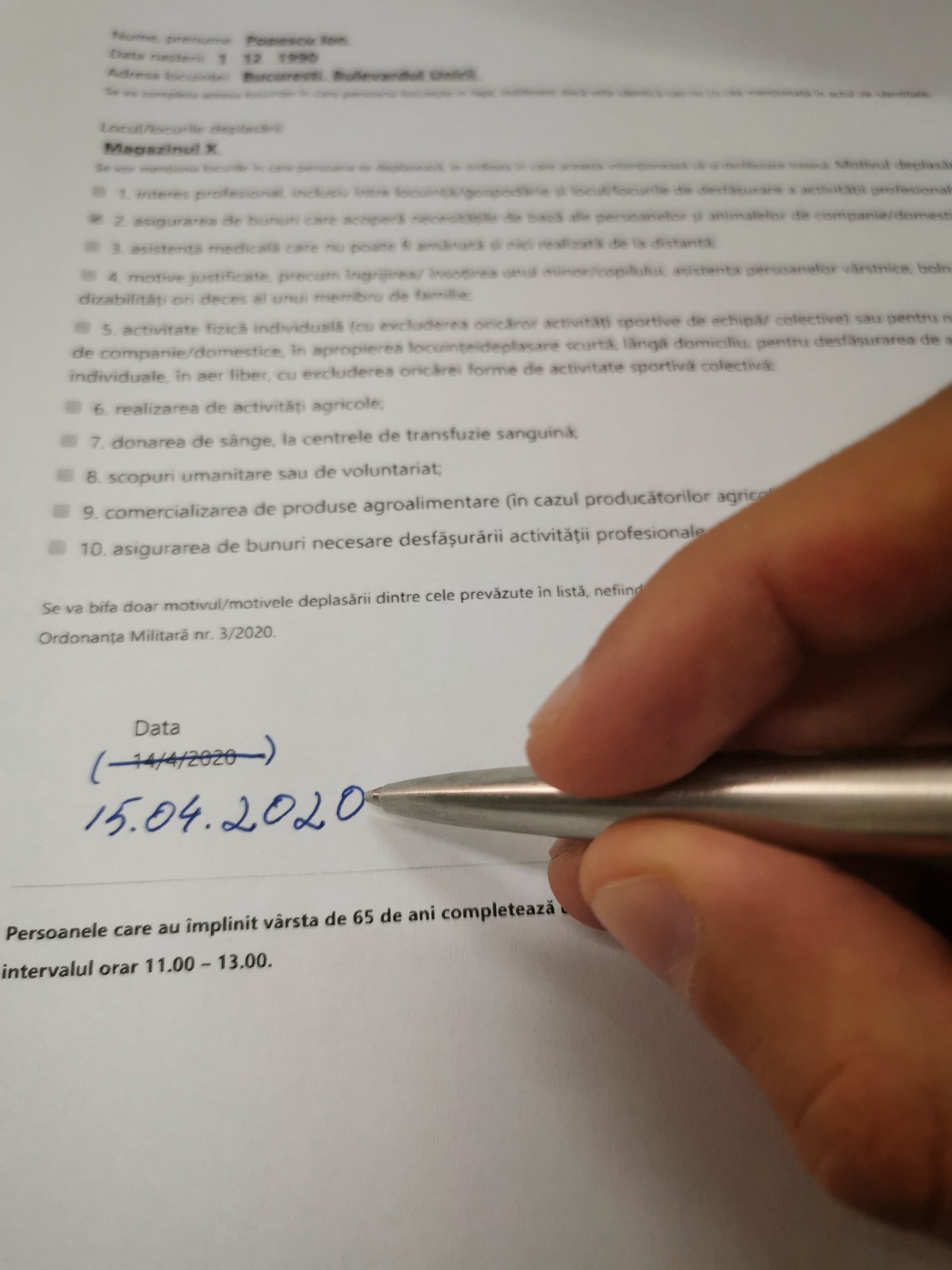 Având în vedere că din cauza restricțiilor este dificil să găsim foi pentru completarea declarațiilor pe proprie răspundere, mai ales pentru persoanele în vârstă sau din mediul rural, este permis să refolosim declarația prin modificare datei, în cazul deplasărilor pentru tratamente medicale frecvente sau pentru deplasări la magazinul din apropierea casei ori la farmacie? În funcție de posibilități, se poate tăia cu pixul sau cu pastă corectoare?