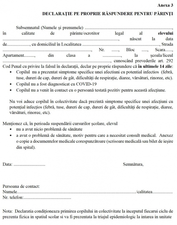 Declarația condiționează primirea copilului în colectivitate la începutul fiecarui ciclu de prezență fizică în spațiul școlar și va fi prezentată la triajul epidemiologic la intarea în unitate. În acest formular părinții declară сă în ultimele 14 zile copilul nu a prezentat simptome specifice unei afectiuni cu potential infectios (febră, tuse, dureri de cap, dureri de gât, dificultăți de respirație, diaree, vărsături, rinoree, etc), nu a fost diagnosticat cu COVID-19 și nu a venit în contact cu o persoană testată pozitiv pentru această afecțiune.