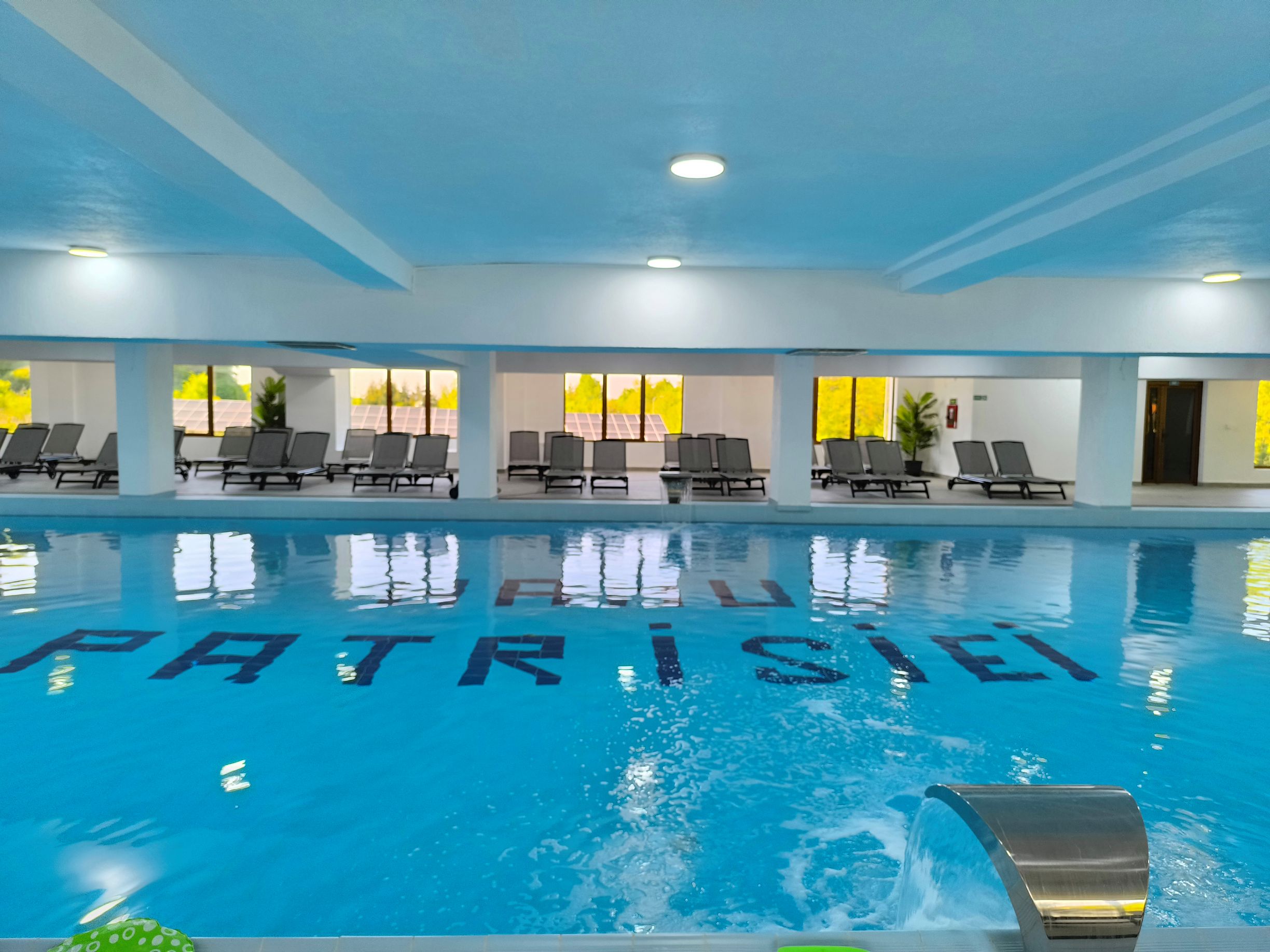 Piscina de la Hanul Patrisiei este de un albastru intens și clar. Se află într-un corp separat de clădirile cu camere și în viitorul apropiat va mai avea saună, salină, spațiu pentru masaj, loc de joacă pentru copii.