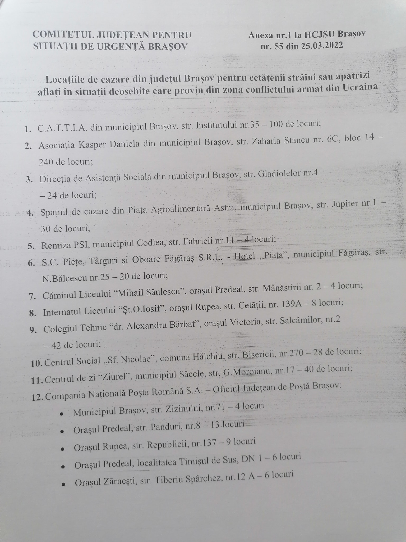 Comitetul Judeţean pentru Situații de Urgenţă din judeţul nostru a emis o Hotărâre în care a stabilit locaţiile de cazare din judeţul Braşov pentru cetățenii străini sau apatrizi aflaţi în situații deosebite care provin din zona conflictului armat din Ucraina