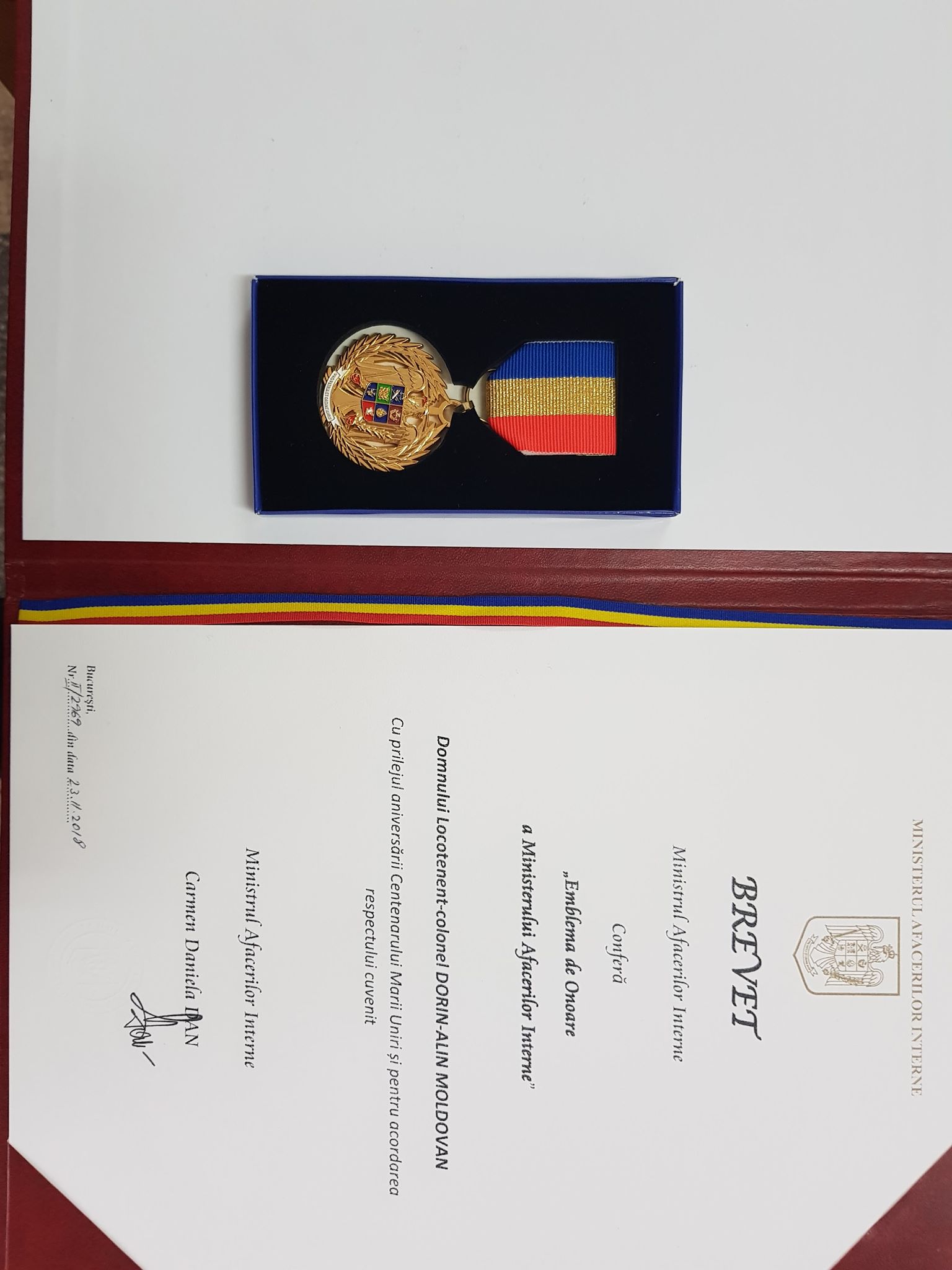 Brevetul și medalia i-au fost conferite cu prilejul aniversării Centenarului Marii Uniri și pentru acordarea respectului cuvenit.