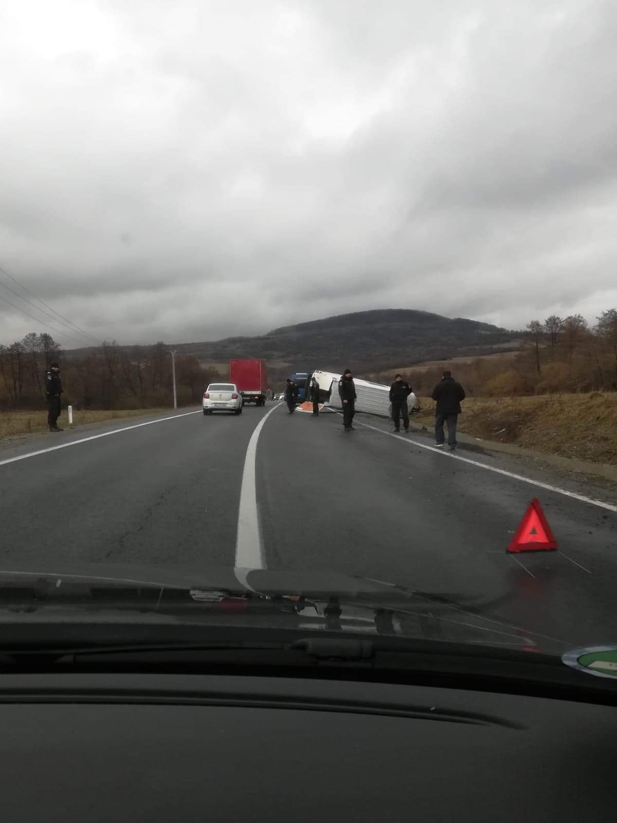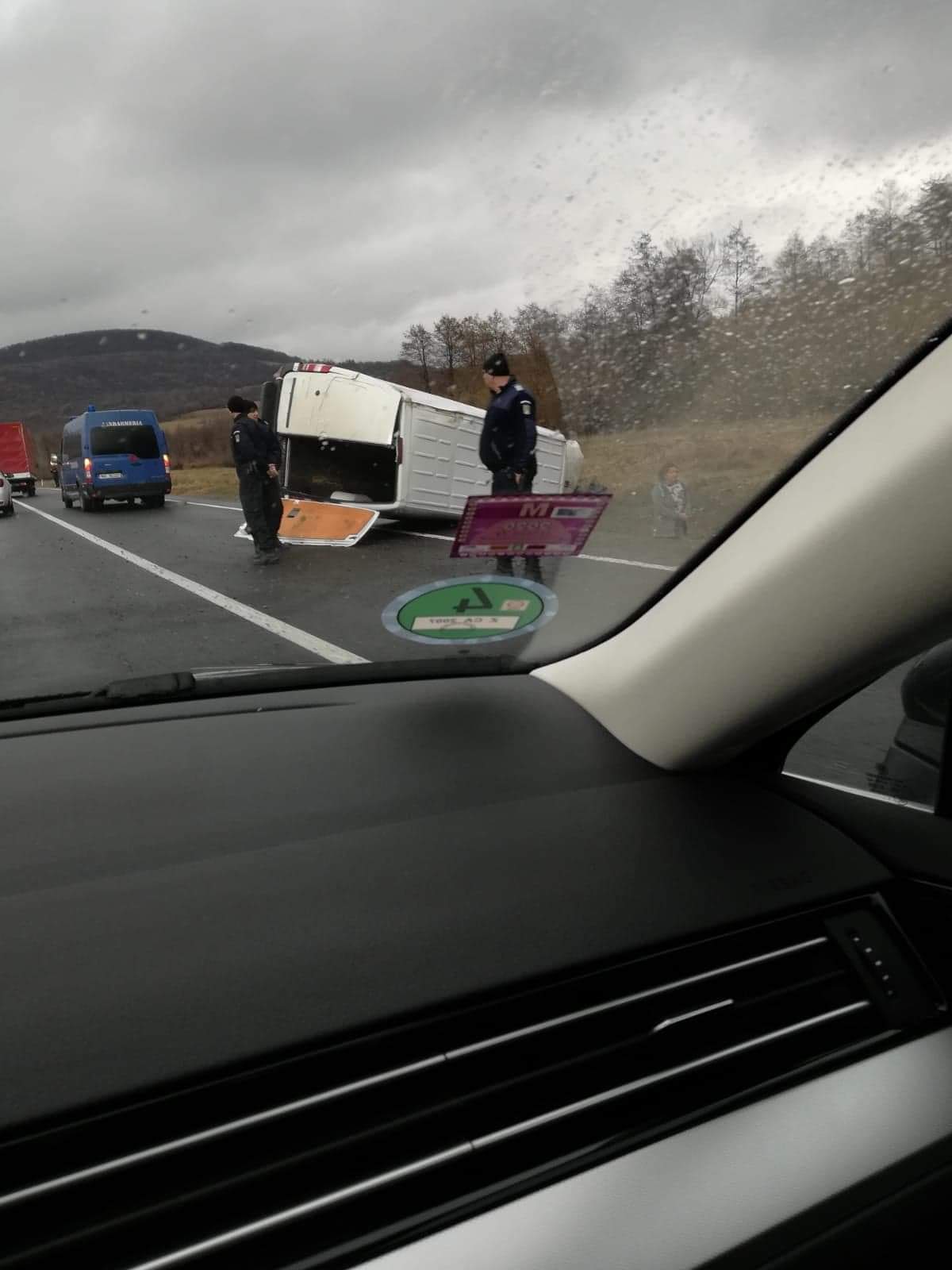 Un microbuz s-a răsturnat,  ocupând o bandă de mers. Cei care dirijează traficul sunt jandarmi aflați în tranzit, potrivit unor martori aflați la fața locului.