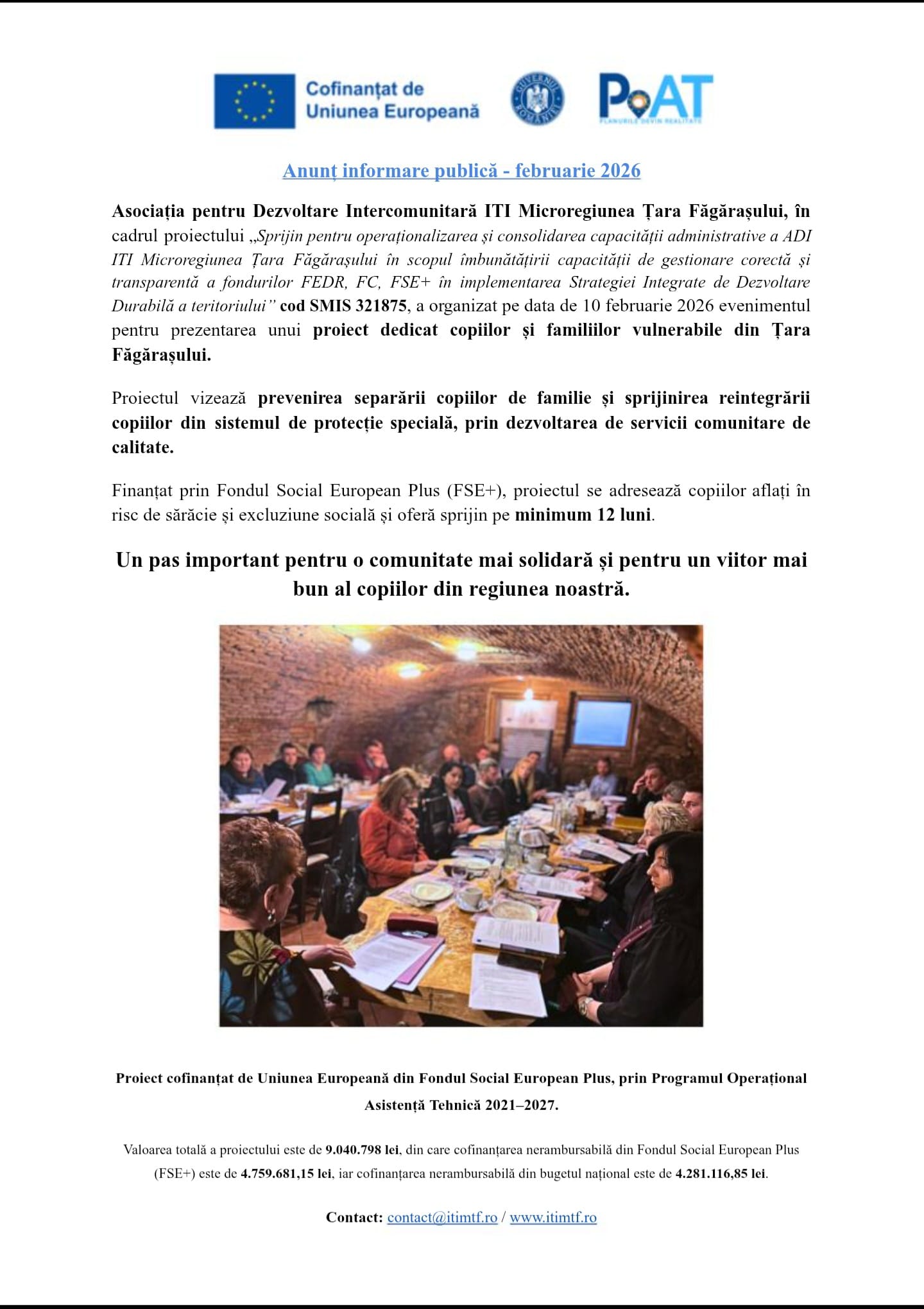 • Asociația pentru Dezvoltare Intercomunitară ITI Microregiunea Țara Făgărașului a organizat marți, 10 februarie, un eveniment de prezentare a unui nou proiect destinat sprijinirii copiilor și familiilor aflate în situații de vulnerabilitate.
