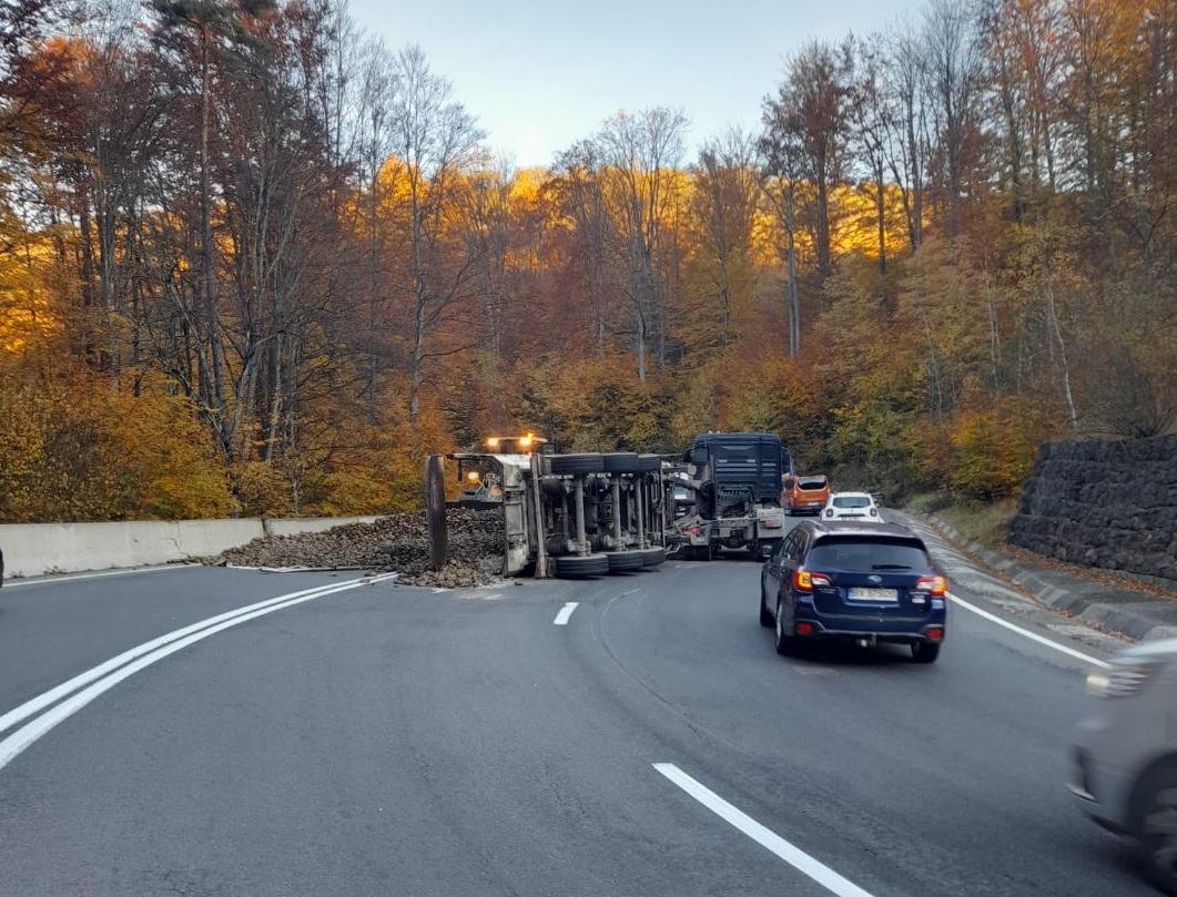 Șoferul unui camion a pierdut controlul volanului pe serpentinele de pe Pădurea Bogății, iar remorca s-a răsturnat pe șosea..