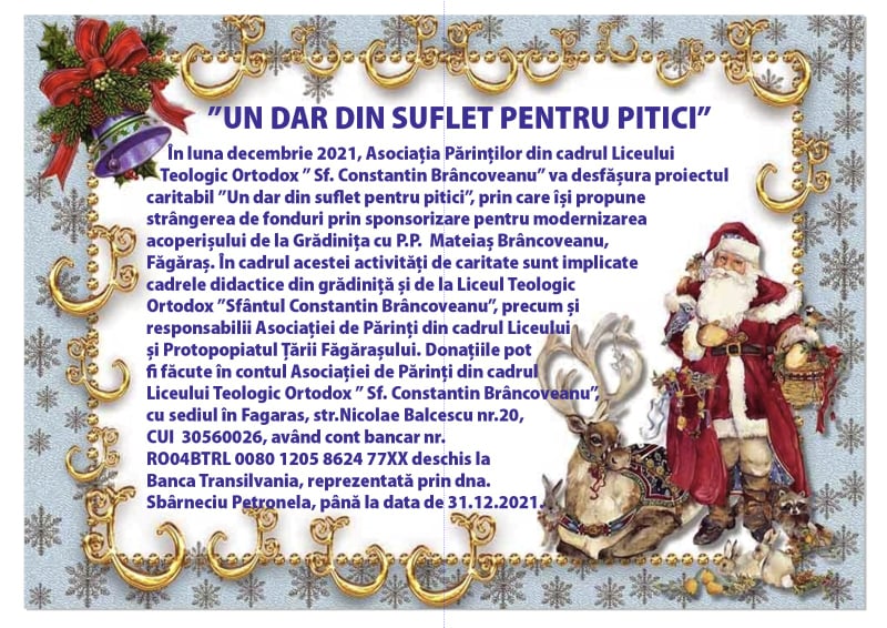 Cei care vor să contribuie cu bani pentru lucrările de la acoperişul clădirii pot face donaţii în contul Asociaţiei de Părinţi din cadrul Liceului Teologic Ortodox ,,Sfântul Constantin Brâncoveanu”, cu sediul în municipiul Făgăraş, strada Nicolae Bălcescu, nr. 20, CUI 30560026, având cont bancar nr. RO04BTRL00801205862477XX, deschis la Banca Transilvania, reprezentată prin doamna Sbârneciu Petronela, până la data de 31.12.2021.