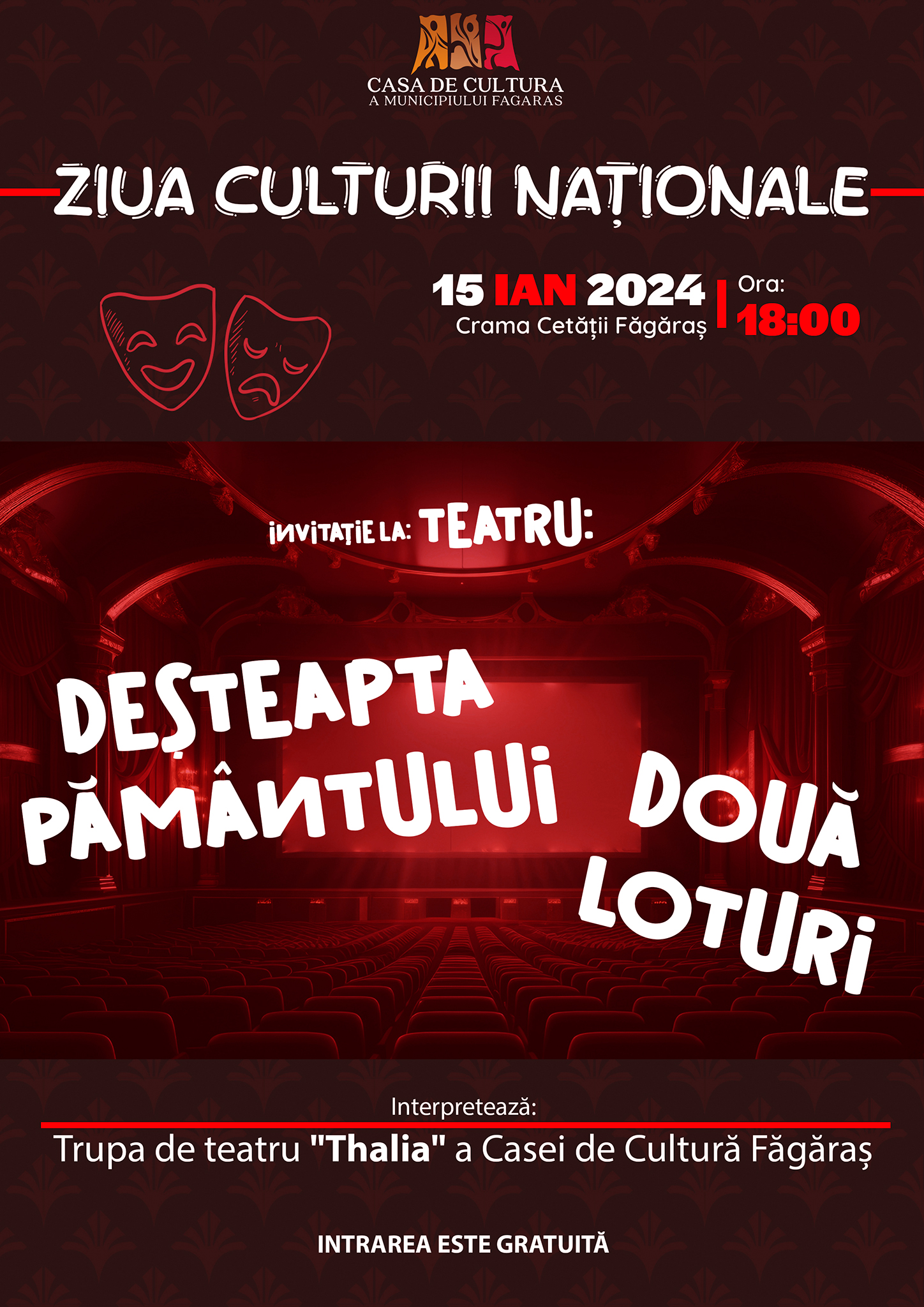 Astfel, luni, 15 ianuarie,de la ora 18.00, în Crama Cetății din Făgăraș vor avea loc două spectacole de teatru, puse în scenă de actorii trupei de teatru Thalia. Este vorba despre ,,Deșteapta pământului” și ,,Două loturi”. Spectacolele sunt dedicate Zilei Culturii Naționale, care se sărbătoreșteîn fiecare an pe data de 15 ianuarie.