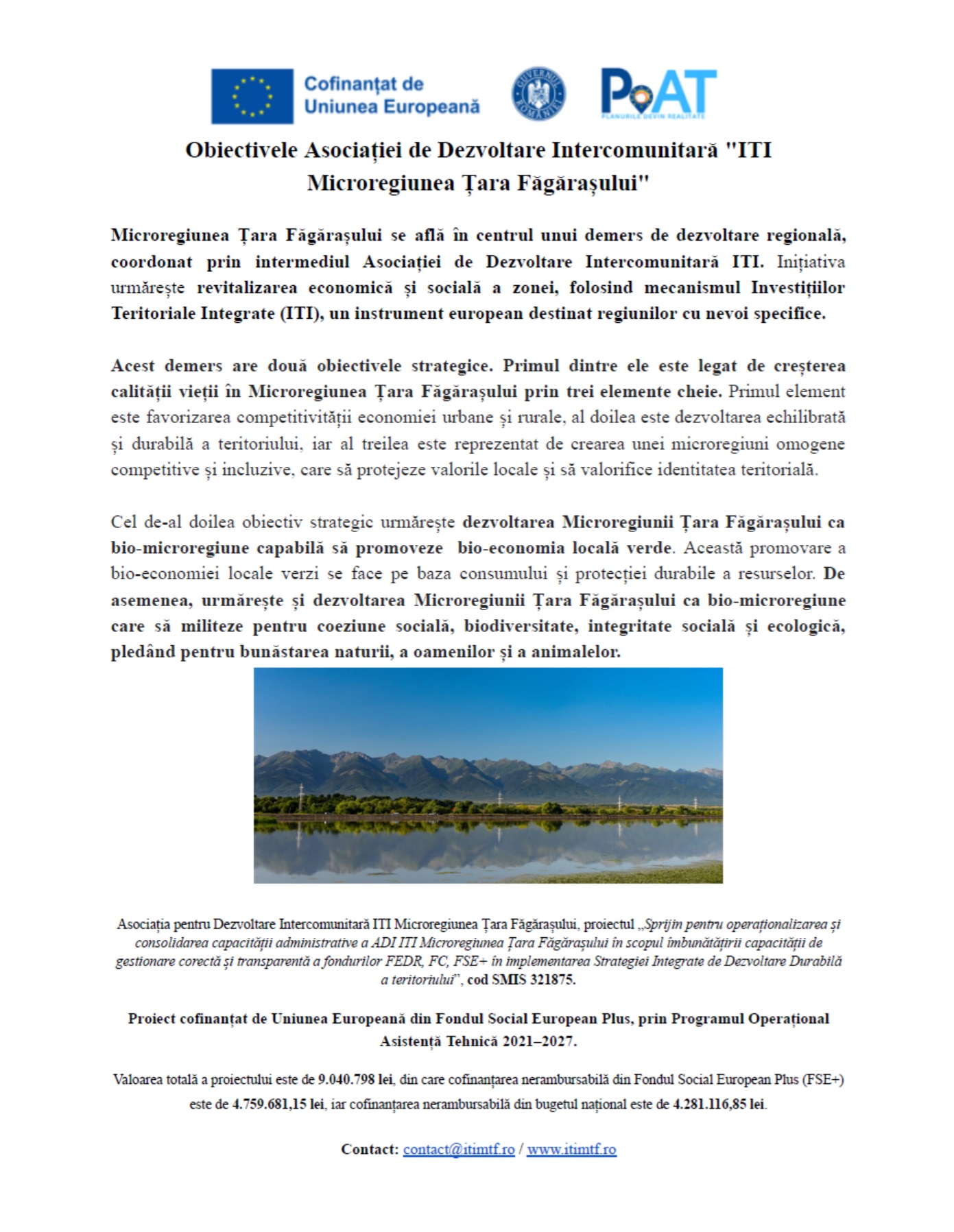 Asociația de Dezvoltare Intercomunitară „ITI Microregiunea Țara Făgărașului” coordonează un demers strategic de dezvoltare regională bazat pe mecanismul Investițiilor Teritoriale Integrate (ITI), instrument european dedicat regiunilor cu nevoi specifice. Inițiativa urmărește modernizarea și creșterea atractivității zonei prin două obiective majore. Primul vizează creșterea calității vieții în microregiune, prin stimularea competitivității economiei urbane și rurale, dezvoltarea echilibrată și durabilă a teritoriului, precum și formarea unei microregiuni omogene, competitive și incluzive, capabile să protejeze valorile locale și să valorifice identitatea teritorială.