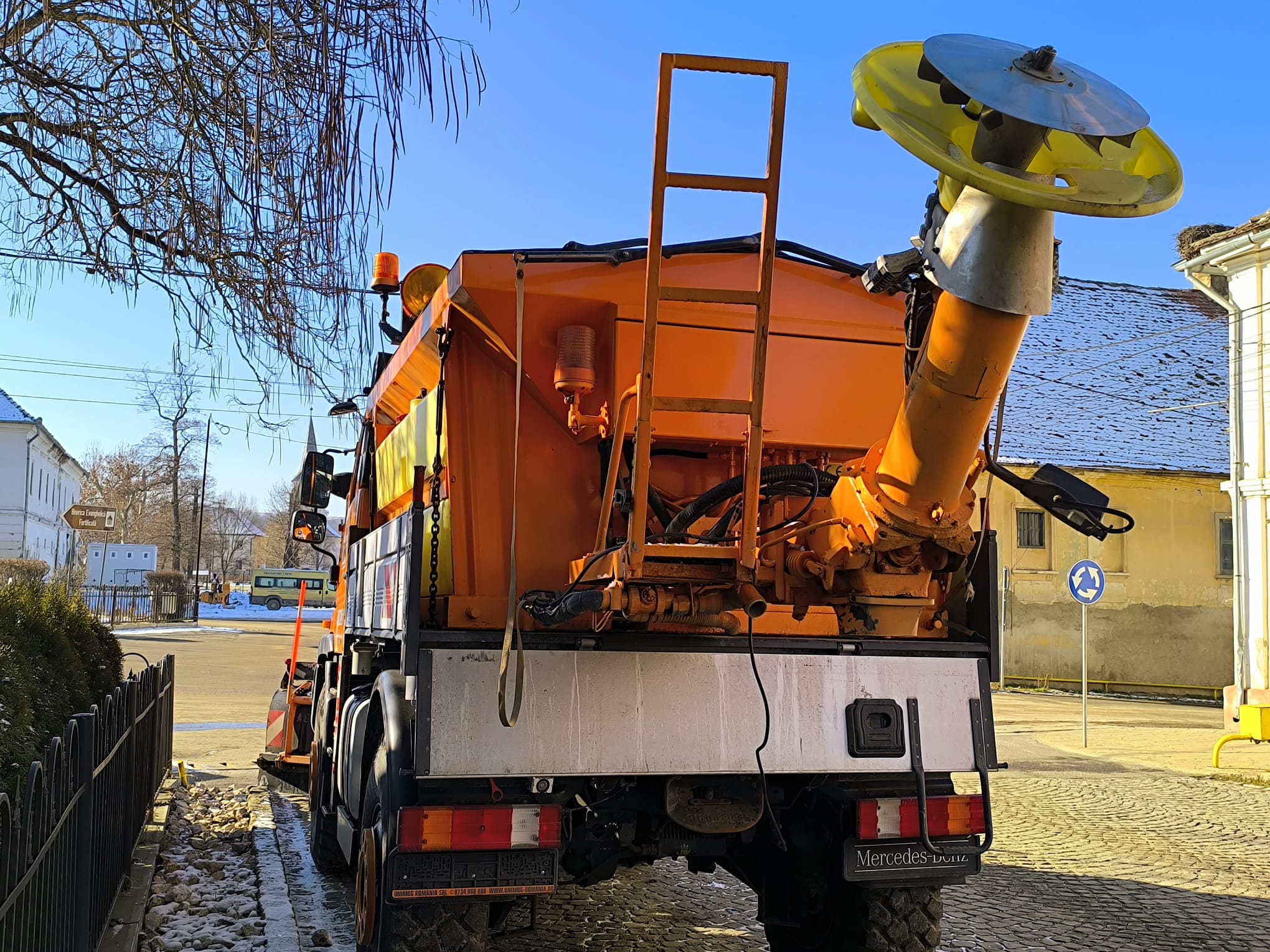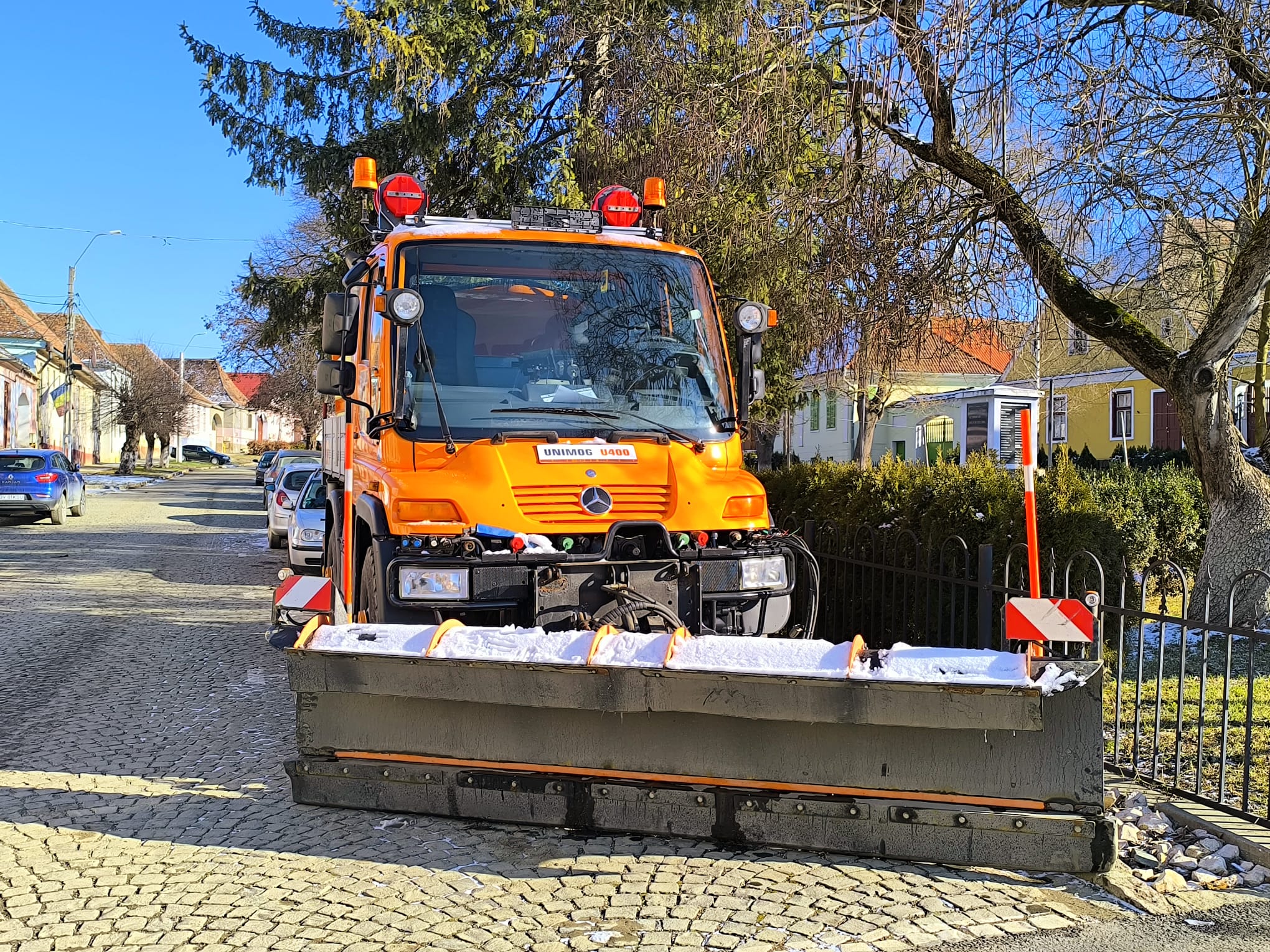 ,,Avem un utilaj multifuncțional nou. La partea din față are un braț pentru cosit iarbă, pe timp de iarnă tot acolo se poate monta o lamă pentru zăpadă. Pe spate funcționează ca o sărăriță, adică are instalație pentru împrăștierea materialului antiderapant (nisip și sare). Utilajul se numește Unimog U 400 și a fost cumpărat în decembrie 2024, cu fonduri proprii din bugetul local. A costat 59.000 de euro fără TVA.”, a declarat primarul Gheorghe Mirca.