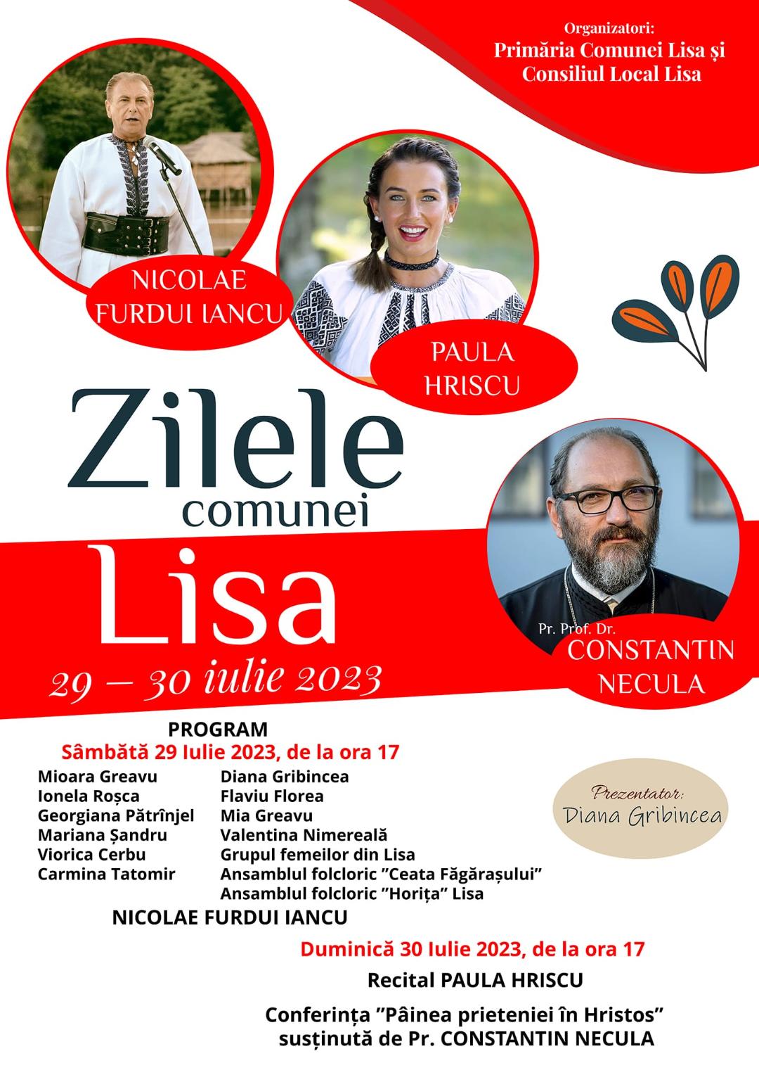 Invitați speciali la Zilele comunei Lisa, din acest sfârșit de săptămână. Sâmbătă, 29 iulie și duminică, 30 iulie, comuna Lisa va îmbrăca straie de sărbătoare.