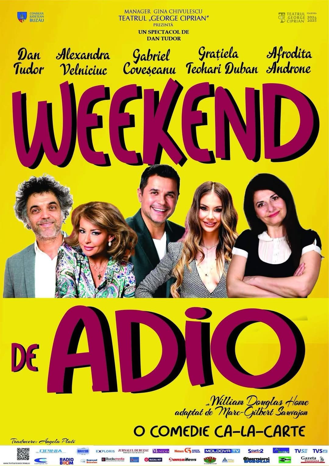 Vineri, 23 mai, de la ora 19:00, Crama Cetății Făgăraș devine scena unei comedii pline de rafinament și surprize: Weekend de adio, în regia lui Dan Tudor.