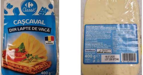 • Un lot de cașcaval din lapte de vacă, comercializat sub marca „Carrefour Classic”, este retras de la vânzare din magazinele Carrefour din România, după ce s-a depistat prezența bacteriei periculoase *Listeria monocytogenes*. Produsul vizat are ambalaj de 400 de grame și provine din lotul 200 BT246, cu data limită de consum 18 iulie 2025.