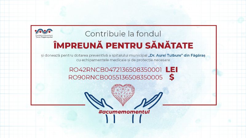 Fundația Comunitară Țara Făgărașului lansează apelul la începerea donațiilor pentru fondul „Împreună pentru sănătate (COVID-19)”, ce își propune atragerea de resurse financiare care urmează a fi rapid direcționate către achiziționarea necesarului de echipamente medicale și de protecție pentru angajații Spitalului Municipal „Dr. Aurel Tulbure“ din Făgăraș, în contextul actual al înmulțirii cazurilor de îmbolnăviri cu virusul COVID-19 pe tot teritoriul României.
