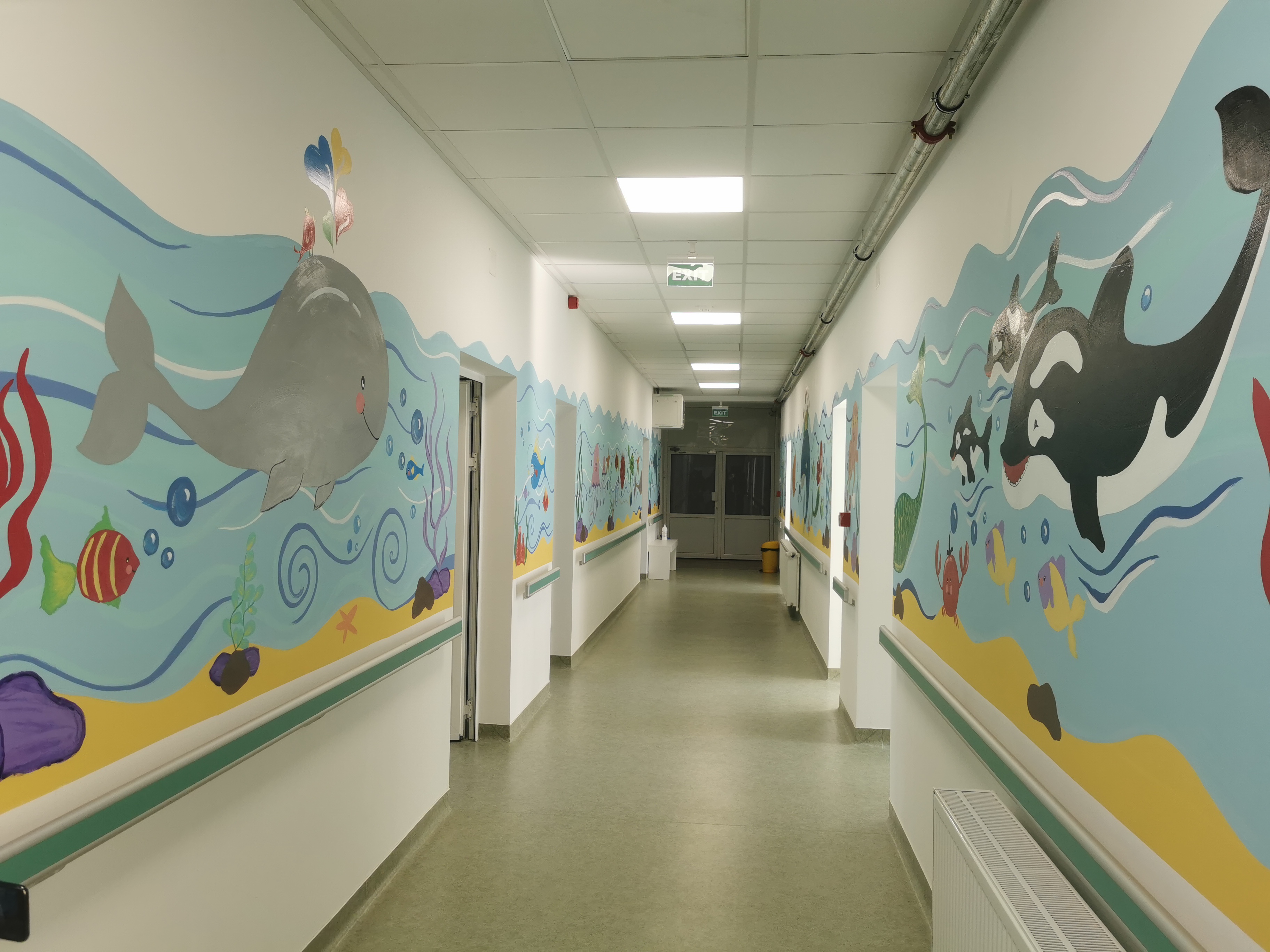 ,,Ca timp de lucru, am terminat parterul de pictat în aproximativ două săptămâni. A fost o muncă asiduă pentru că a trebuit să fie făcută într-un timp scurt, într-un ritm accelerat. Dar am avut şi nişte ajutoare, 5 copii, printre care şi fetiţa mea. Ei au venit în două rânduri să mă ajute şi a contat foarte mult şi mânuţa lor. Am ales să fac picturi cu lumea subacvatică, care este o lume infinită. Eu, ca să pot să acopăr pereţii, să fie culoare peste tot, m-am gândit că aş putea să fac un fundal care să reprezinte apa, iar cu atâtea animale subacvatice cu siguranţă voi reuşi să acopăr toată zona, care să devină plăcută şi prietenoasă pentru copii. Câştigul pe care l-am primit pentru pictură l-am donat ,,Cutiuţei Călătoare”, care are în continuare un proiect de înfrumuseţare”, a declarat Nicoleta Opriş, cea care a pictat tot parterul secţiei.