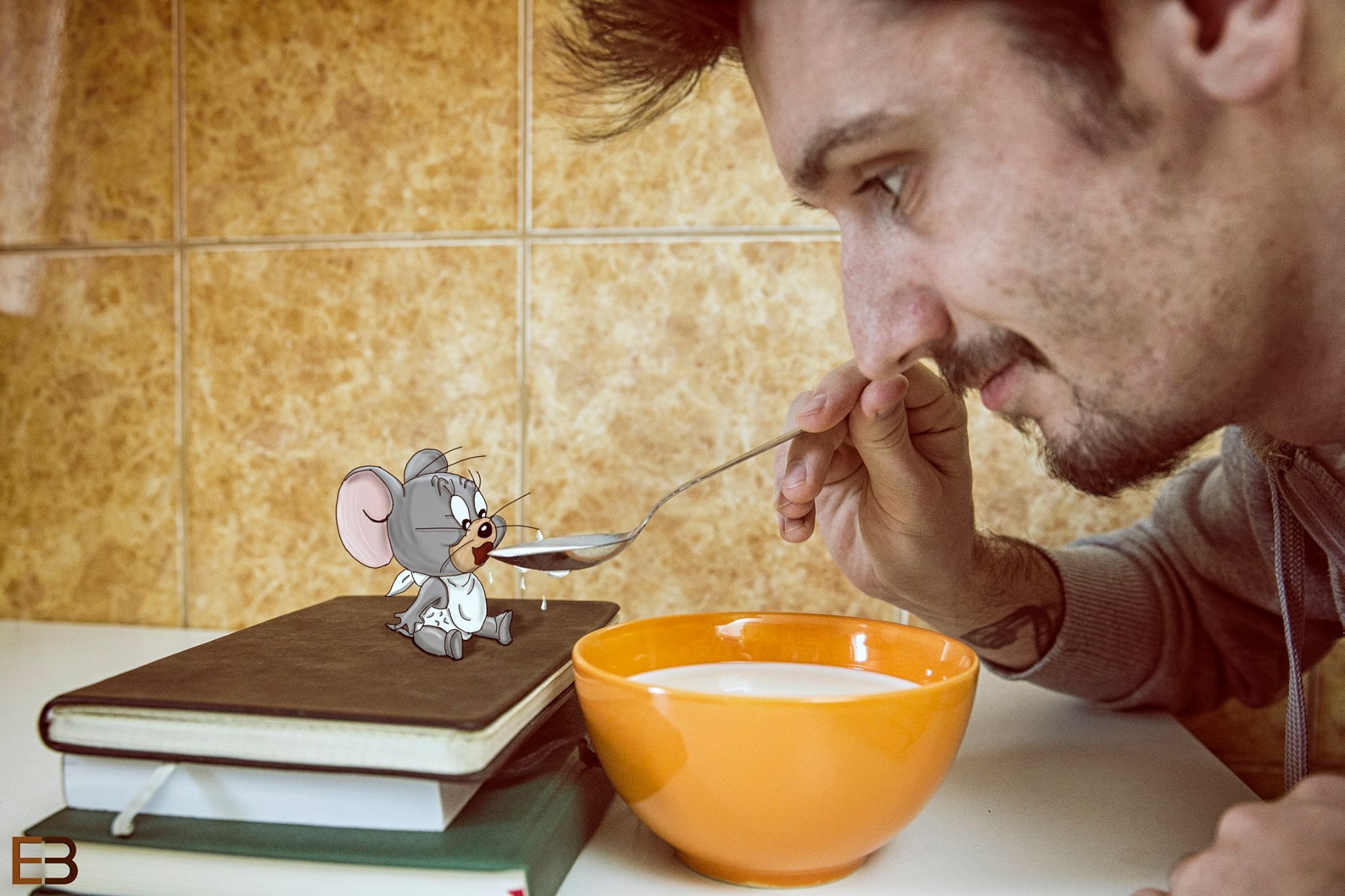 Poate vă amintiţi de Ervin şi din alte proiecte fotografice. Lui i-a venit ideea de a face nişte fotografii în care să combine viaţa reală cu viaţa fictivă din desene animate. Aşa a ajuns, de exemplu, să-i dea lapte cu linguriţa celebrului Jerry (să nu-mi spuneţi că nu ştiţi desenele cu Tom şi Jerry).