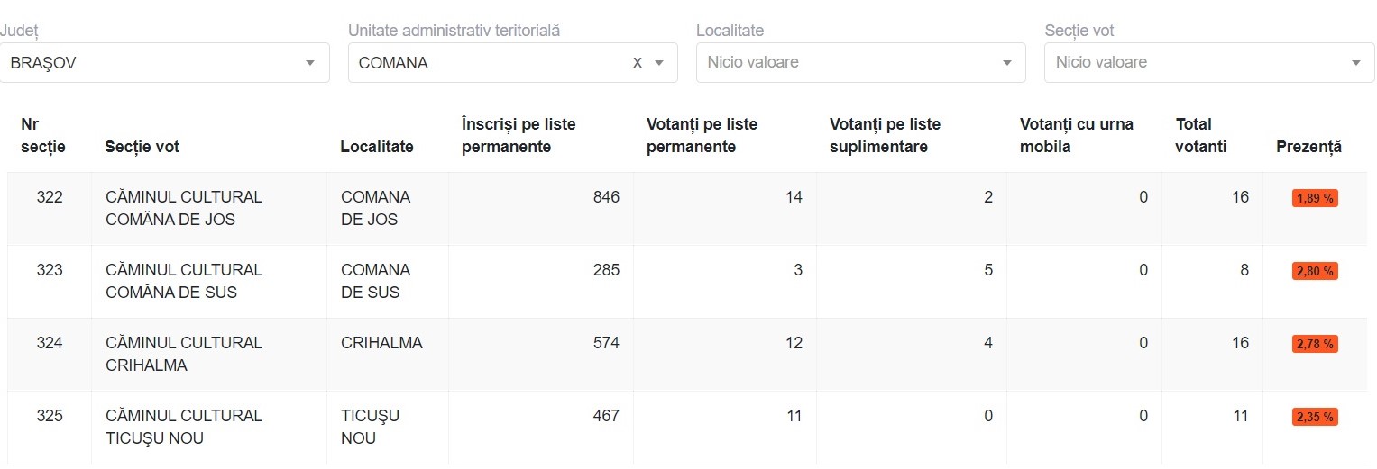 • secţia nr. 325 în căminul cultural de la Ticuşu Nou cu 467 de votanţi arondaţi