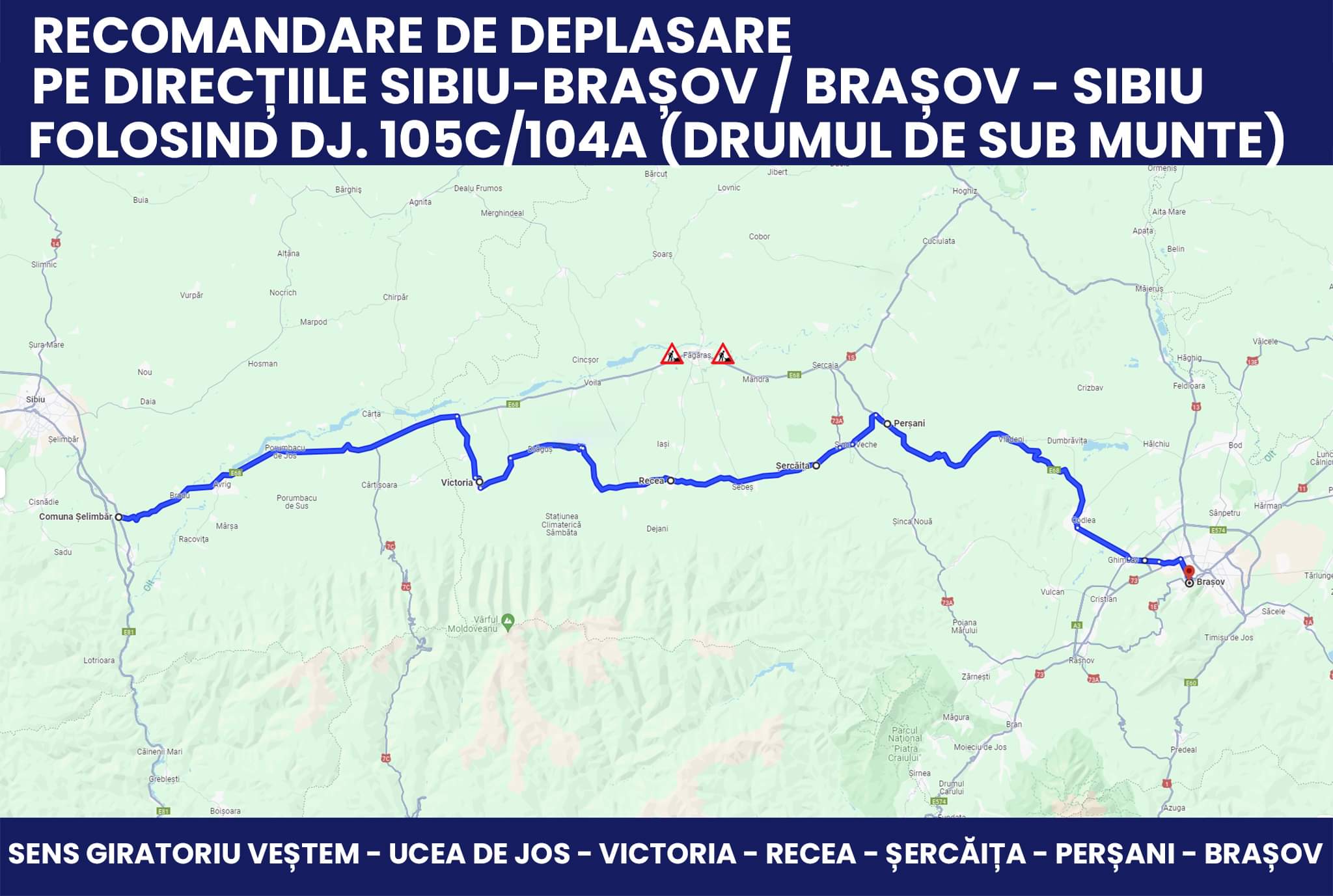 Având în vedere cele de mai sus, administrația locală recomandă șoferilor care doresc să tranziteze municipiul Făgăraș să folosească o rută alternativă de circulație, pe DJ105C, respectiv DJ104A (Drumul de sub munte – recent renovat).
