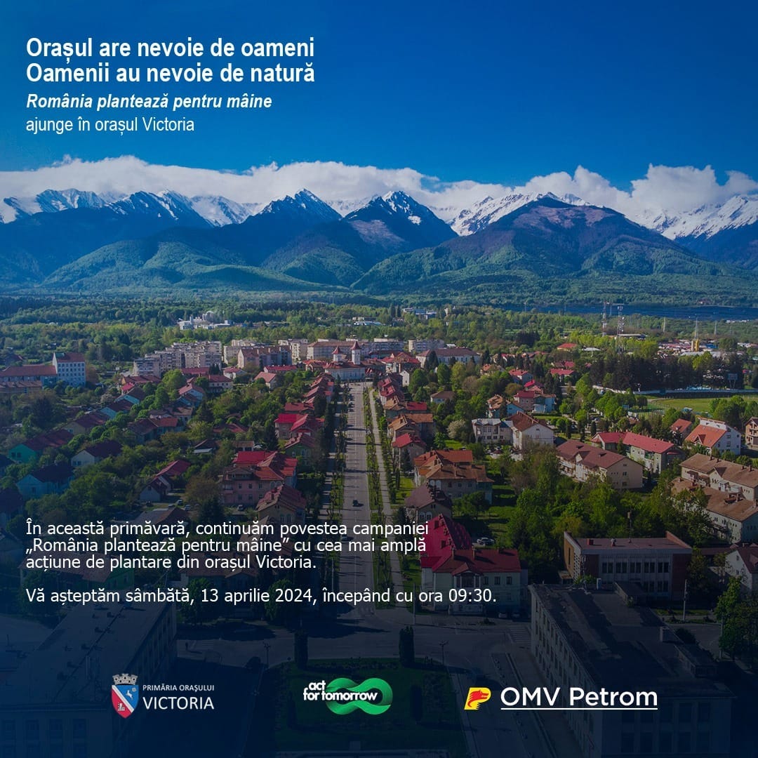 ,,Am luat legătura cu un ONG al companiei OMV Petrom, care ne va ajuta să facem plantări în această primăvară în oraşul nostru. Acţiunea de plantare se va desfăşura sâmbătă, 13 aprilie 2024, de la ora 09.30, şi va fi o colaborare între Primăria Victoria şi Asociaţia Act for Tomorrow. Terenul pe care vom face împăduriri este situat în zona de sud a orașului, strada Salcămilor, zona Pieții. Scopul e ca la final să avem oxigen mai mult în oraş, spaţiu verde pentru relaxare şi o imagine mai bună ca localitate. Eu şi colegii mei din Primărie vom fi acolo să ajutăm ca voluntari. Se zice că orice om trebuie să planteze măcar un pom în viaţă, dar noi vrem să ne facem datoria şi pentru generaţiile viitoare! Vă invităm alături de noi şi alături de alţi voluntari din toată ţara. Dacă vreţi să participaţi, intraţi aici https://forms.gle/FJriyKaiShcdXqys8 şi completaţi-vă numele. Mi-ar plăcea să ne vedem acolo!”, a declarat primarul Camelia Bertea.