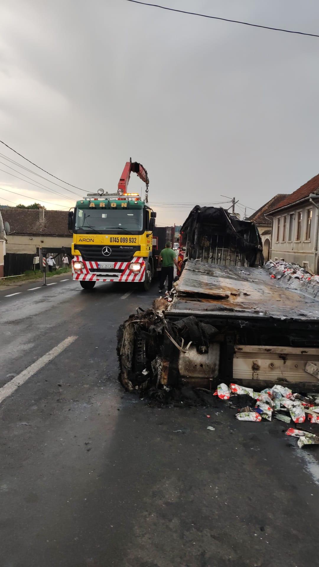 Polițiștii au declarat că și în această dimineață traficul este blocat în acea zonă, DN13, km 81 + 200, la intrarea în localitatea Bunești, pentru îndepărtarea semiremorcii distruse în urma incendiului.