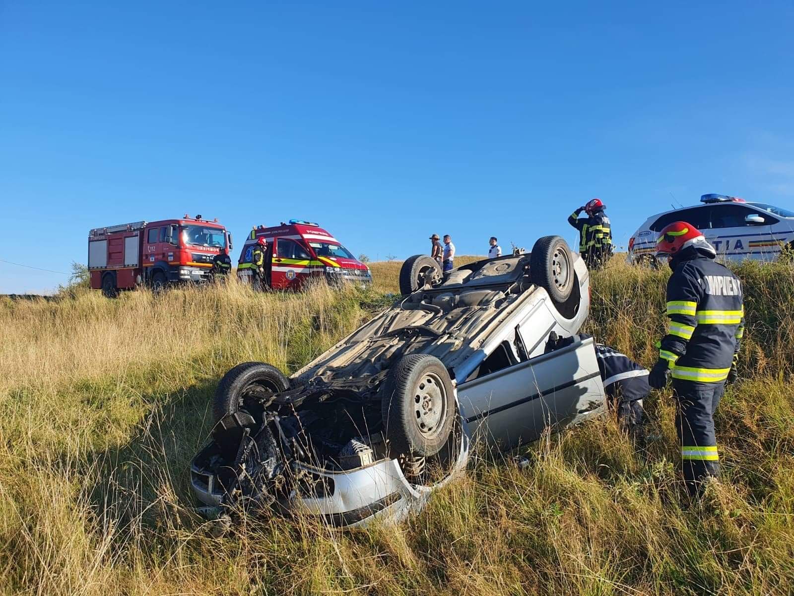 Din primele informații, un autoturism s-a răsturnat, rezultând o victimă conștientă. La fața locului se deplasează o autospecială de lucru cu apă și spumă, un echipaj de descarcerare și un echipaj SMURD.